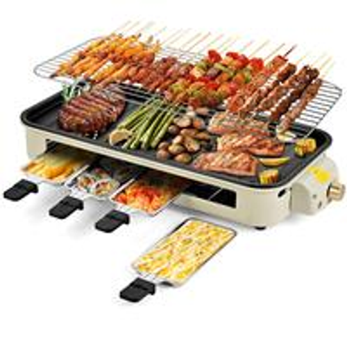 Party Must Have 1500W White Smokeless Electric Grill Non-Stick Griddle + 3 Raclette Pans Perfect for Steaks Seafood & Feasts Use Indoors & Out